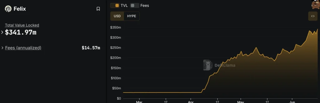 Felix 是一個提供去中心化穩定幣 feUSD 和借貸服務為主的 DeFi 協議,用戶可以存入 HYPE 或 UBTC 作為抵押資產並借出 feUSD。目前 TVL 為 340M,抵押資產價值 292M,是 HyperEVM 規模第二大的 DeFi 項目。