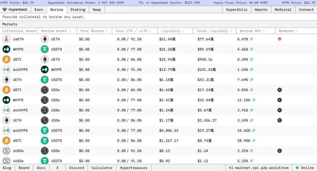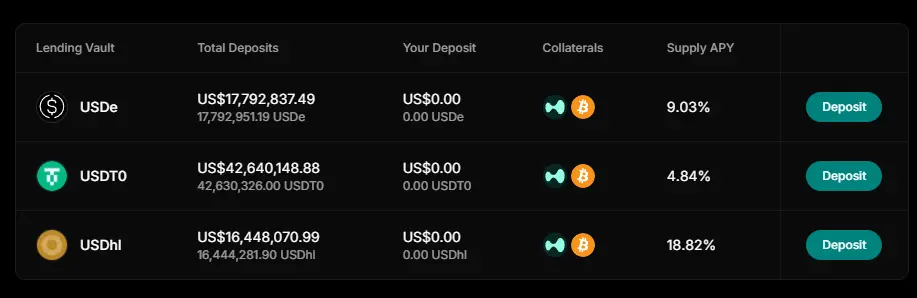 而除了自家的穩定幣 feUSD 之外,用戶亦可以在 Felix 上借出 USDe、USDT0 和 USDhl 三種穩定幣,雖然除了 USDhl 之外收益比較低,但對於 Hyperliquid 的原生用戶而言有更多選擇,可以根據需求借出相對應的穩定幣,靈活參與不同生態。