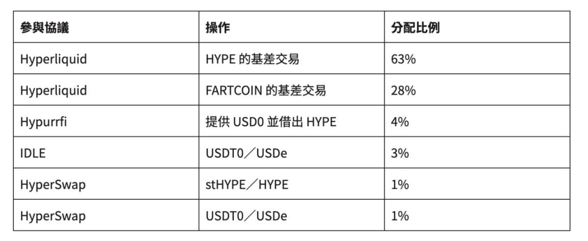 需要留意的是,不論是哪一個金庫,目前的 APY 數值都是理想值,因此有可能會隨市場狀況而有所波動。尤其 Hyperbeat USDT 所提供的收益看起來很吸引人,但細看其策略就會發現該金庫的大部分報酬都來自 HYPE 和 FARTCOIN 的基差交易,風險會比較高。