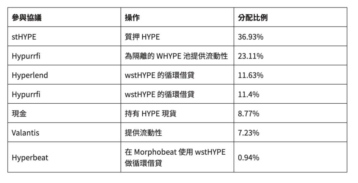 Hyperbeat Ultra HYPE 則是根據 WHYPE 建構的收益金庫,和 Hyperbeat USDT 不同的是,該金庫的策略可以全面地參與多個 Hyperliquid 的生態項目並累積積分,適合長期看好 Hyperliquid 的空投玩家。該金庫的收益組成如下: