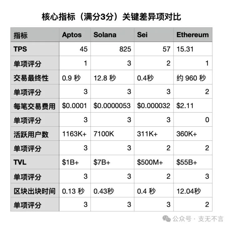 Aptos 和 Solana 以 32 分并列第一,Sei 以 30 分紧随其后,Ethereum 和一众 L2 则只有 26 分或更低。