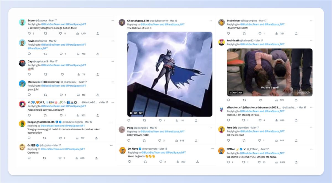 图注:2023 年 3 月 17 日,BlockSec 在完成了针对 Paraspace NFT 市场的攻击拦截后,在 Paraspace 进行质押的 NFT 大户挤满了评论区,感谢 BlockSec 拯救他们的 NFT。