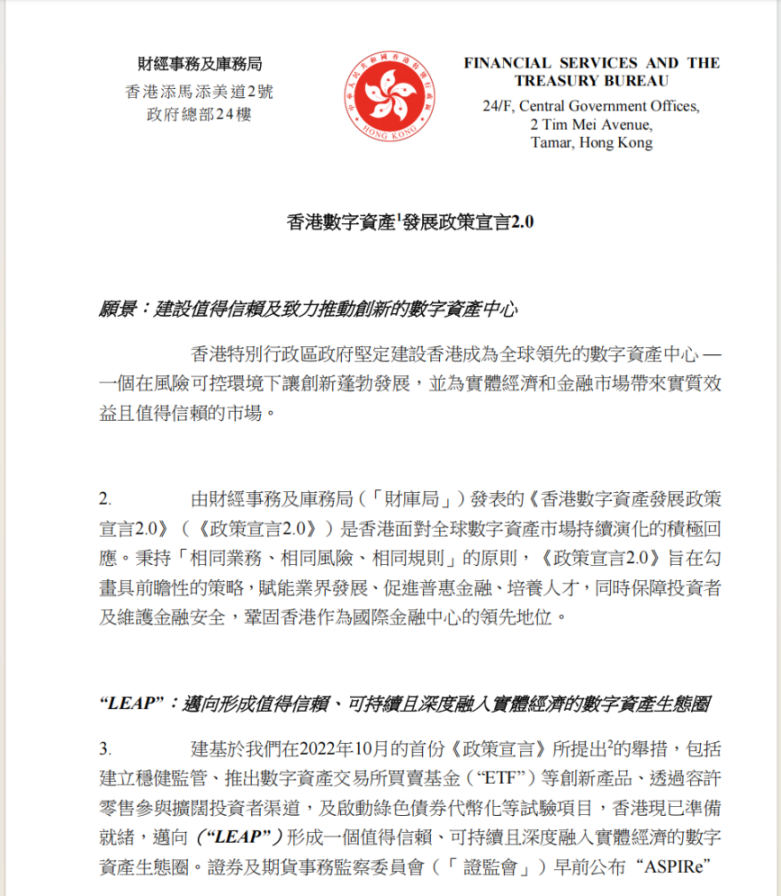 《政策宣言 2.0》旨在将香港打造成数字资产领域的全球创新中心,进一步更新和完善现有政策和监管框架,以适应数字资产行业的快速发展。
