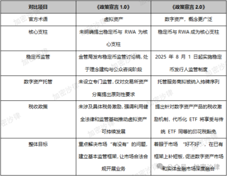 所谓的「宣言 1.0」,全称是:《有关香港虚拟资产发展的政策宣言》(以下简称:《政策宣言 1.0》),《政策宣言 1.0》于 2022 年发出,其阐明了香港特区政府为在香港发展具活力的虚拟资产行业和生态系统而订定的政策立场和方针,其中包括:香港政府的愿景与方针、对虚拟资产的监管框架、香港政府推出的绿色债券及数码港元等试验计划、香港政府对于虚拟资产未来的展望等等。而《政策宣言 2.0》是在其基础上的进一步升级,其中包括:目标延续、监管深化、重点拓展、场景扩大、术语转变、增加税收激励等内容,二者的区别见如下表格: