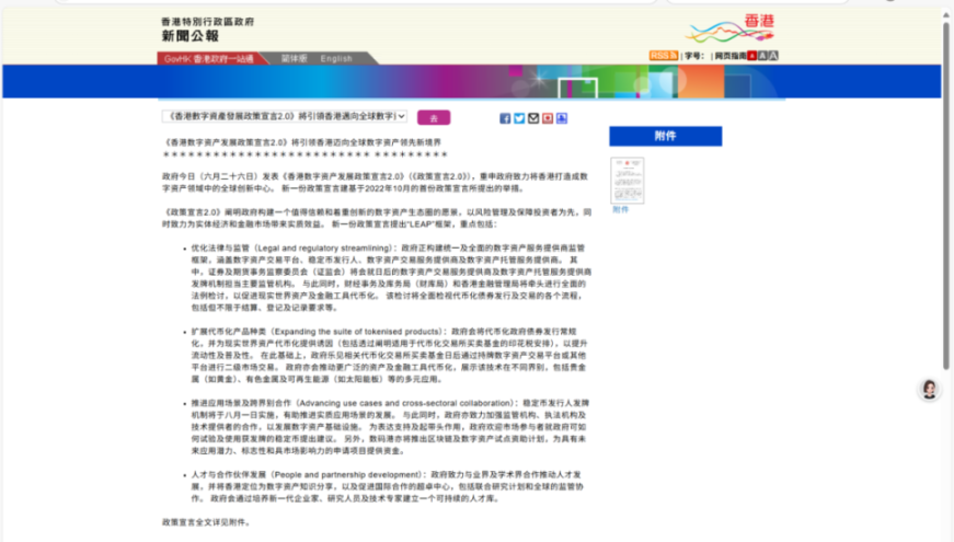 上图为香港政府在其官网发布的有关《政策宣言 2.0》发布公告
