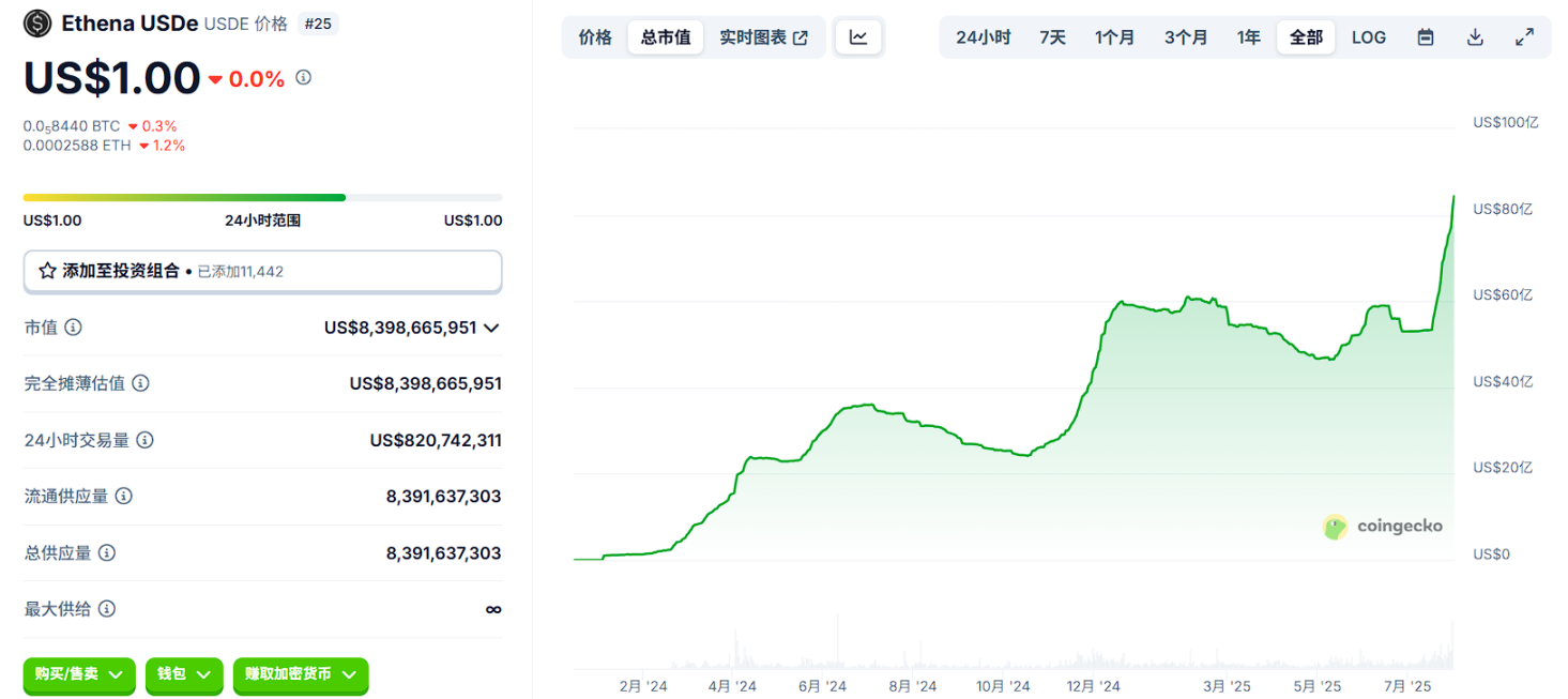 2024 年以来,稳定币市场正经历一场由结构创新驱动的新变局。在 USDT、USDC 等法币托底稳定币占据主导多年后,Ethena Labs 推出的 USDe 凭借 「无需法币支持」 的 合成稳定币设计迅速崛起,市值一度突破 80 亿美元,成为 DeFi 世界中的 「高收益美元」 。
