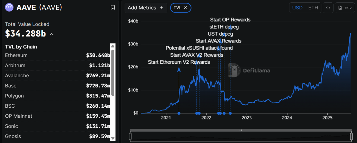 Aave 是以太坊生态中历史最悠久、使用最广泛的去中心化借贷协议之一,最早可追溯至 2017 年。其通过 「闪电贷」 机制和灵活的利率模型,在早期推动了 DeFi 借贷系统的普及。用户可将加密资产存入 Aave 协议中获得利息,或通过抵押资产借出其他代币,全流程无需中介。目前,Aave 协议总锁仓量(TVL)约为 340 亿美元,其中近 90% 部署于以太坊主网,平台原生代币 AAVE 总市值约 42 亿美元,在 CoinMarketCap 上排名第 31 位。