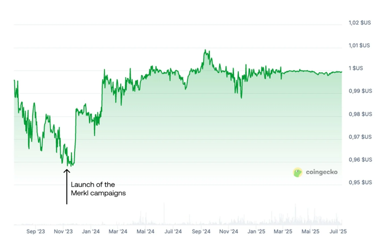 这一案例揭示出 Merkl 在维稳机制中的角色本质:通过可编程激励策略,维持链上关键交易区间的流动性密度,就如同在市场价格锚点上安排「补贴摊贩」,只有持续给予收益,才可能维持稳定的市场结构。但是这也引出相关问题:一旦激励中断或摊贩撤离,价格机制的支撑亦可能失效。