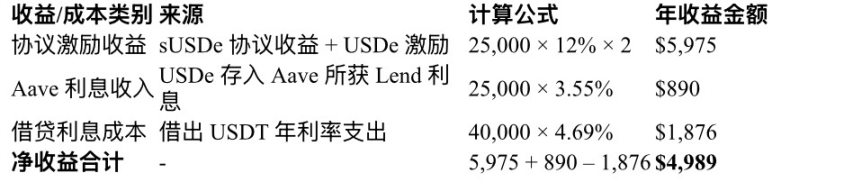 该收益的前提依赖于「借贷 – 存入 – 继续借贷」循环建立的复合结构,即初始本金被用作第一轮质押后,借出资金后再进行下一轮 USDe 与 sUSDe 的双向存入。通过 5 倍杠杆放大质押头寸,总投入达到 50,000 美元,从而放大奖励与基础收益。