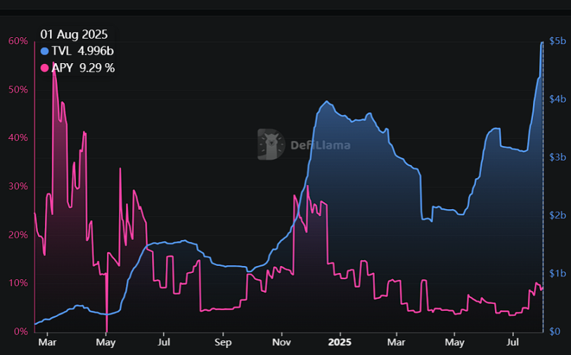 从 DeFiLlama 数据可以观察到:USDe 与 sUSDe 的 TVL 在 2025 年 6 月 ETH 价格冲高期间同步下降,且并未出现伴随价格上涨而增加的年化收益(APY)。这一现象与上一轮牛市(2024 年底)形成对比:彼时 ETH 达高点后,TVL 虽逐步回落,但过程相对缓慢,用户并未集体提早赎回质押资产。
