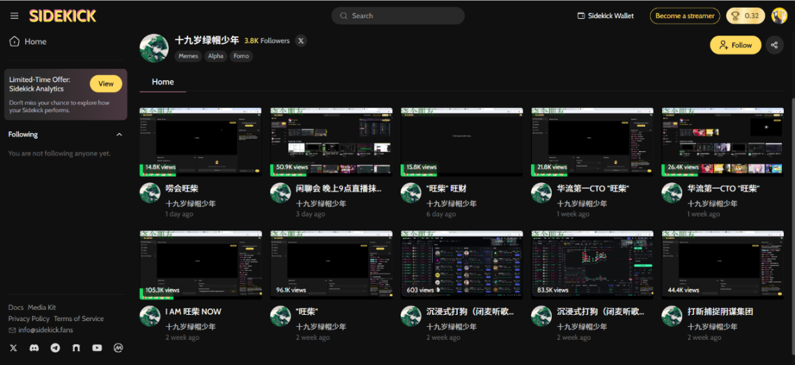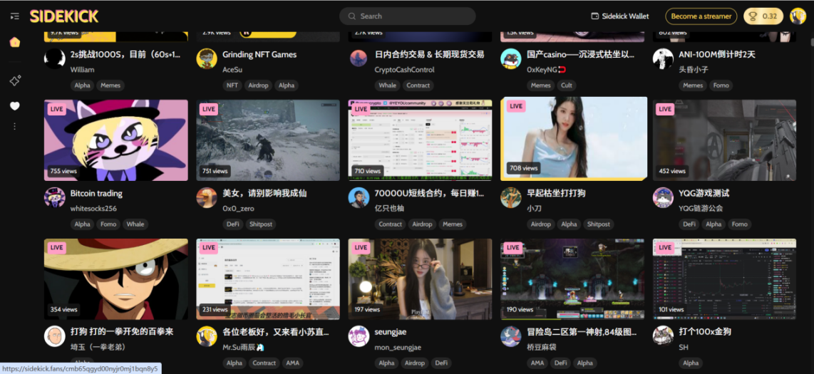 与抖音、快手、Twitch 等传统直播平台相比,Sidekick 最大的创新点在于将直播与区块链交易相结合,提出了名为“LiveFi”的模式,通过直播将观众注意力直接转化为数字资产交易动力。其平台类似于 Twitch,但内置了交易系统,让主播可以在直播中推广交易策略直接获取收入。同时,Sidekick 探索了“直播扫链”“直播开合约”等新玩法,直播中主播可边扫描链上行情边推荐交易,用户可边观看边买卖合约;还设计了陪伴式空投互动,观众在直播中参与任务获得代币奖励。这些基于区块链的交互和奖励机制突破了传统只靠打赏和广告的模式,实现了“内容资产化”和“交易实时化”,为直播行业带来创新。