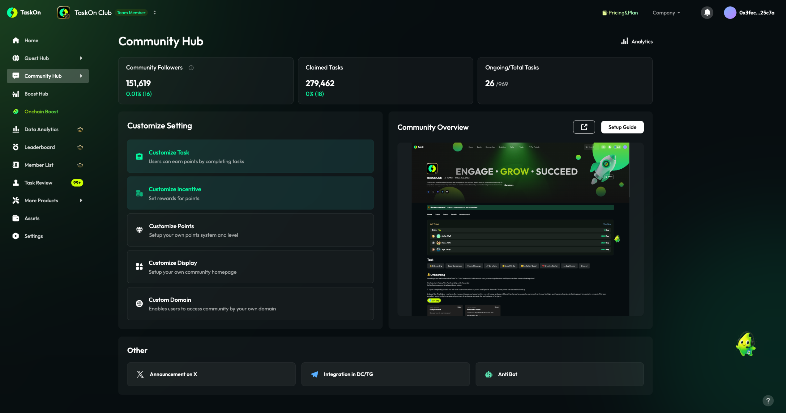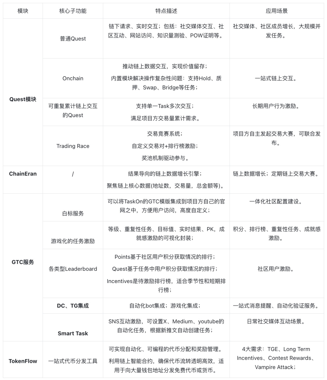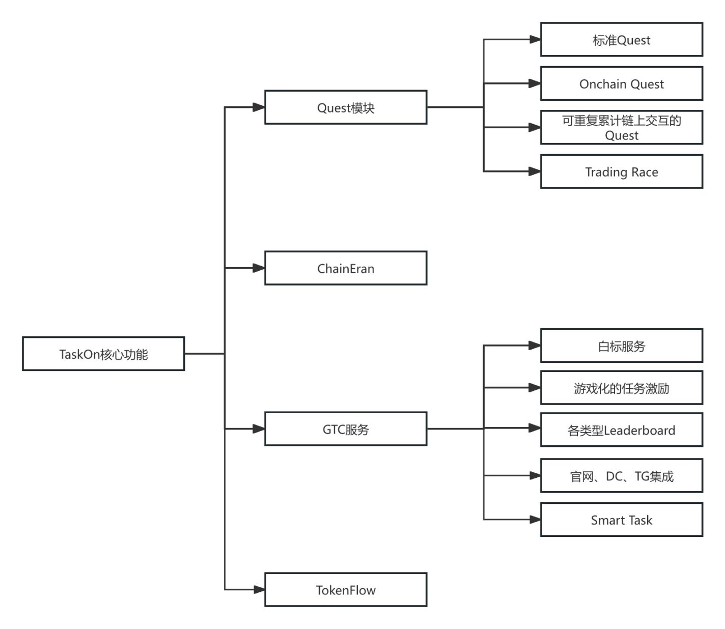 TaskOn 核心产品由 Quest、Community(GTC)、ChainEran、Token Flow 四大板块内容,围绕着社区运营、吸引用户、用户留存、链上数据等纬度配置着链上、链下任务,进行定制化任务设置。