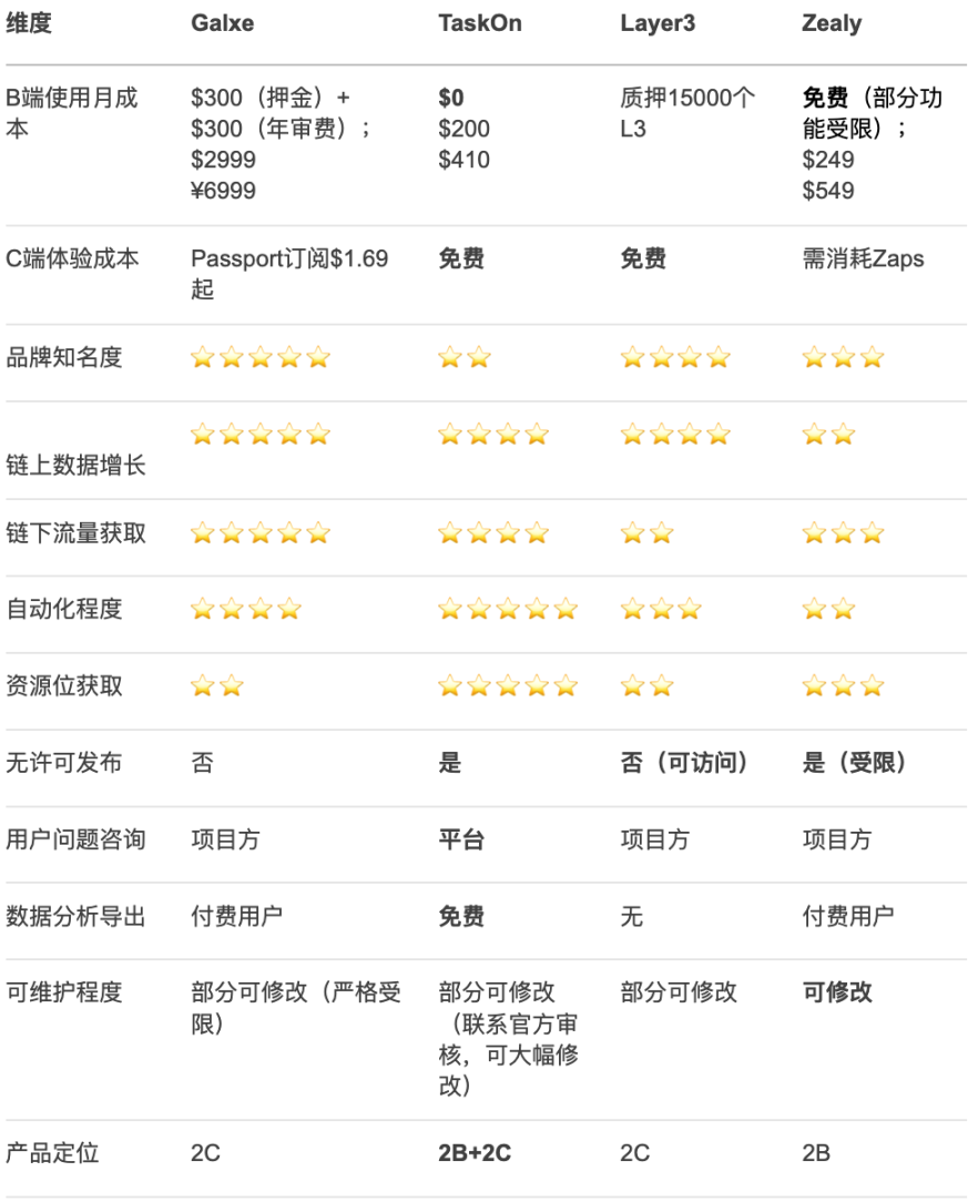 例如在官方合作咨询反馈上,四家平台都内置咨询窗口,Layer3 主要以邮件回复为主,Galxe、Zealy 平台内回复较慢,只有 TaskOn 通过 Telegram 社区可以实现官方秒回复。