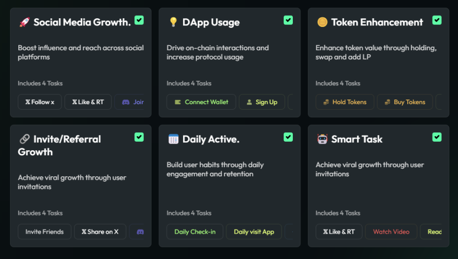 Zealy 的产品逻辑是依托于模块化社区为主线,通过文本描述来设置 Task 内容,产品方便快捷但智能化缺失,更适合基础性社交媒体、社区增长使用。