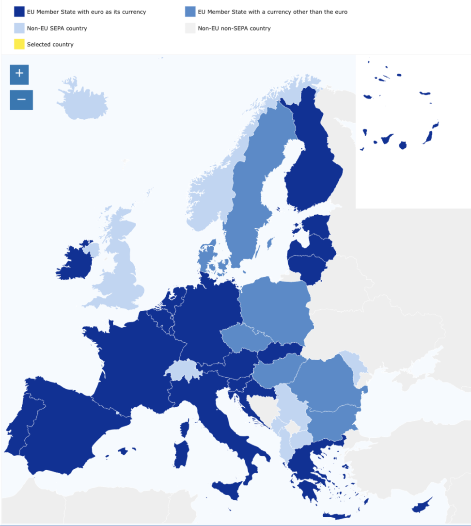 在说这个之前需要解释四个概念,虽常被混用,但在支付和监管语境下,其界限需要被清晰划分,那就是欧洲、欧盟、欧元区和 SEPA 区。首先,“欧洲”仅是一个地理区域,而“欧盟(EU)”是一个由部分欧洲国家组成的政治与经济联盟。并非所有欧洲国家都是欧盟成员。同样,欧元区(Eurozone)是使用欧元作为官方货币的欧盟国家集合,也就是说,欧盟成员中并非所有国家都使用欧元。