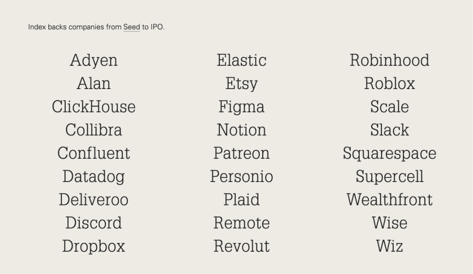 除去这些退出案例,Index 还是 Roblox、Revolut、Adyen 和 Datadog 的最大或第二大股东,几乎覆盖了全球最具代表性的成长型科技公司: