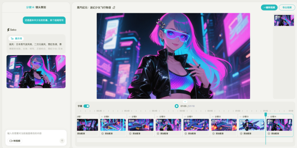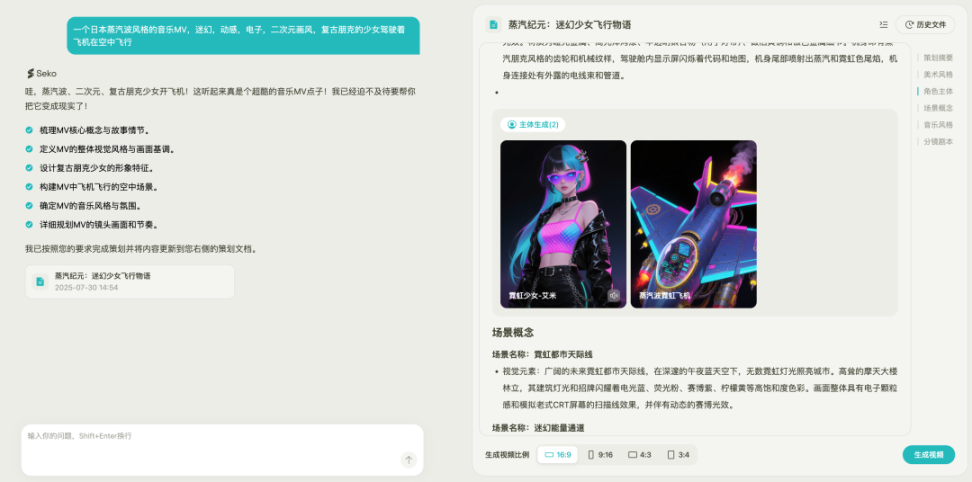 例如,我们在输入一句描述 —— “一个日本蒸汽波风格的音乐 MV,迷幻,动感,电子,二次元画风,复古朋克的少女驾驶着飞机在空中飞行”,这次即使没有选择具体的 IP 形象,Seko 也会生成风格高度匹配的角色与元素,还拟了一个项目标题《蒸汽纪元:迷幻少女飞行物语》: