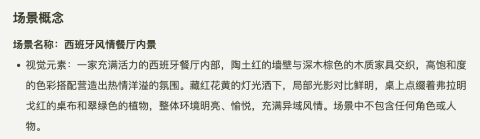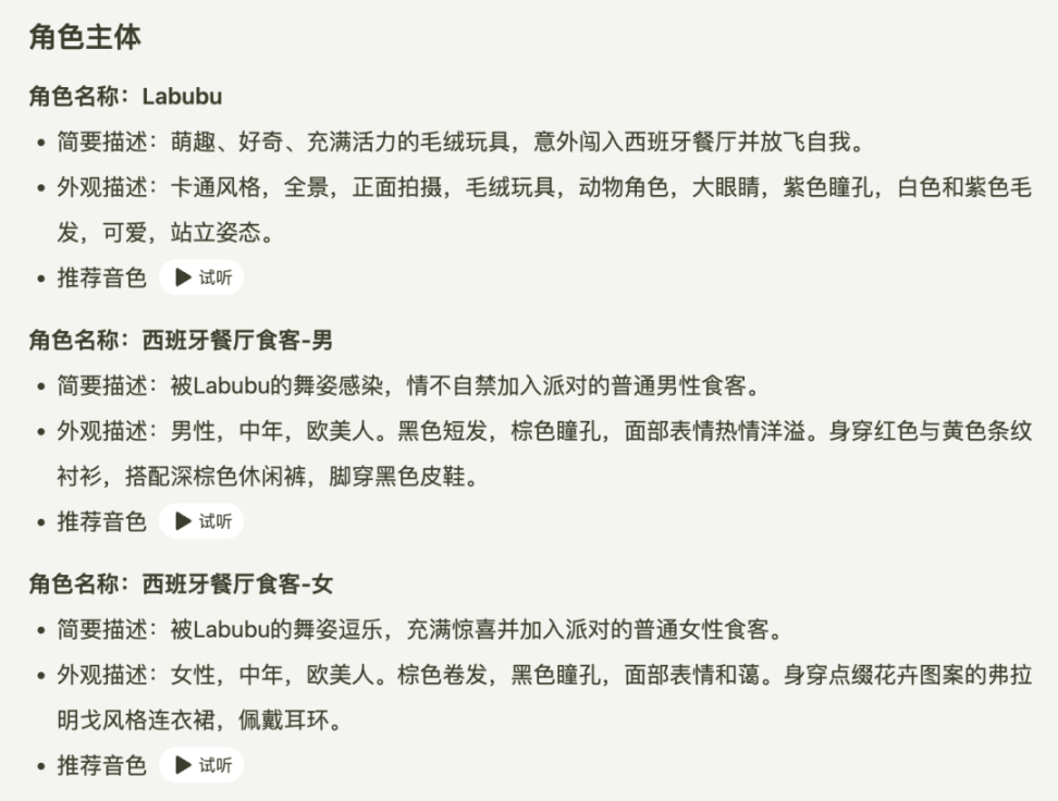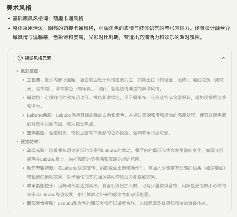 Seko 会根据上传的图片自动分类并给出主体描述,实在是“懒人”的福音。随即又输入一个刚才脑海中想到的画面—— “ Labubu 在西班牙餐厅热情跳舞”,接下来 Seko 会根据这句话拆解并优化一串 Prompt,覆盖短片的故事、视觉风格、角色形象、场景元素、音乐风格以及分镜头设计等 6 个维度 :