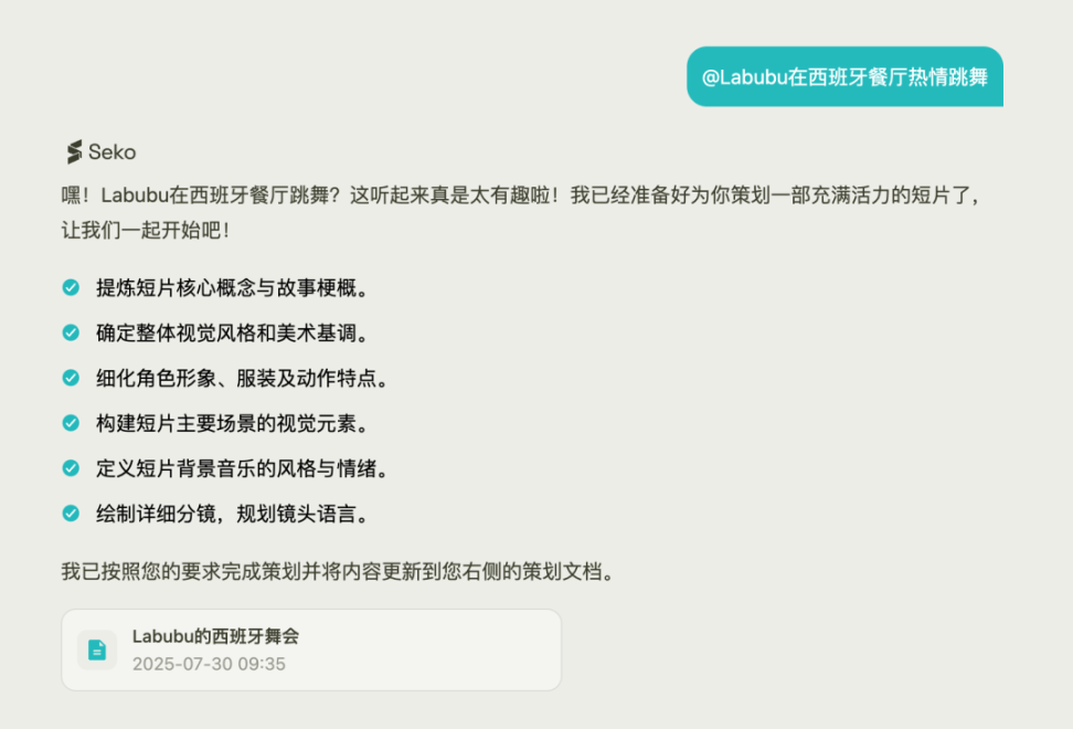 Seko 的核心逻辑是让“自然语言”成为创作入口,用户只需用中文描述想法,系统就能自动完成剧本理解、镜头拆解、画面生成和台词配音,全程无需 prompt,也无需在多个平台之间来回切换。