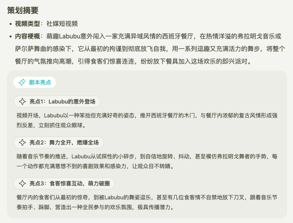 1)策划摘要:定义了视频类型以及内容梗概,并结构化的给出了剧本的主要亮点:
