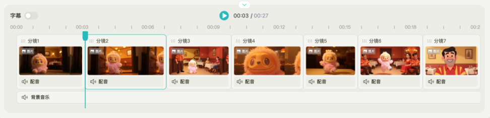 仔细看 Seko 生成的 分镜头画面,角色和剧本的一致性把握的质量很高。用户可以在编辑轨道上添加配音和添加字幕,也可以在左侧栏中继续对整个剧本和画面提出修改的内容。