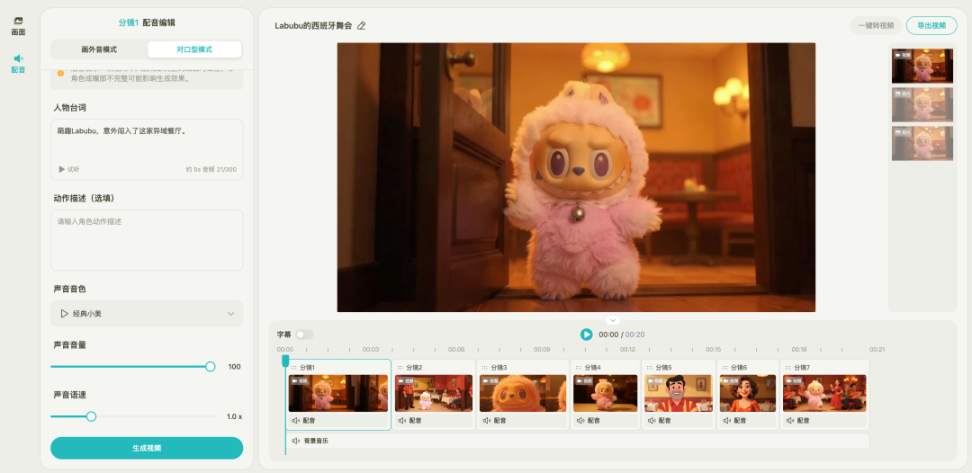 此外,还可以点击左侧的「配音」,Seko 提供了台词、音色、音量以及语速等基础功能,还能通过「动作描述」,编辑动态 Prompt 生成对口型的视频: