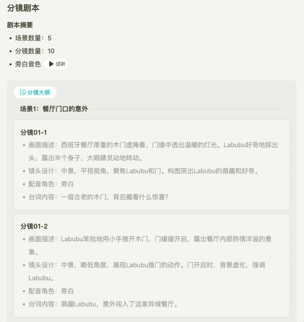 6)分镜剧本:Seko 设定了 5 个场景,10 个分镜,并搭配了旁白银色;以场景 1 为例,Seko 给到了 2 个分镜,并且强调了画面和镜头设计,涉及到了镜头语言&参数、角色动作、画面色彩与切换。