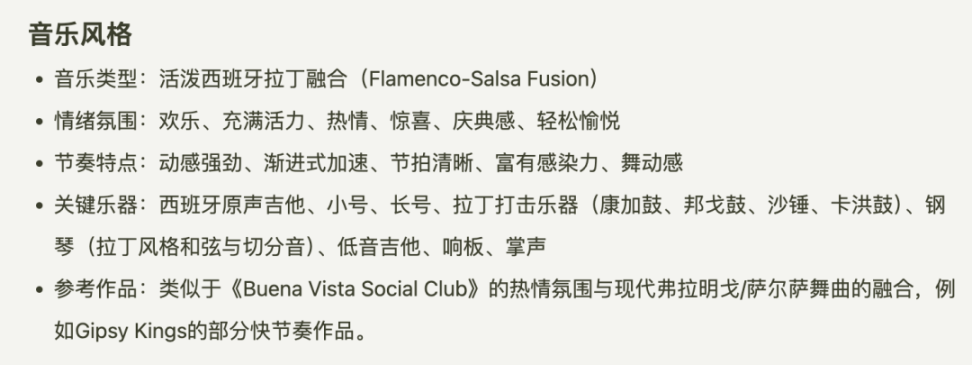 5)音乐风格:对于一个不太懂音乐的创作者,Seko 给到的 Prompt 非常友好,从音乐类型、情绪氛围、节奏特点、关键乐器以及参考作品等多个维度明确需求。