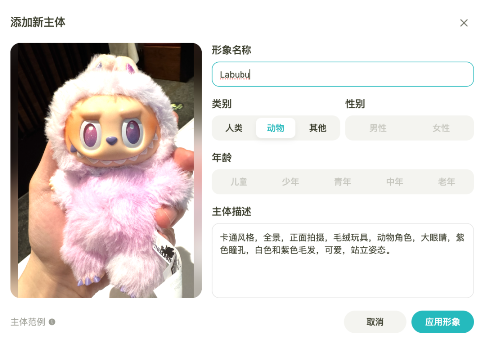 Seko 的首页创作提供了一个选项 —— 添加主体,用户可以个人新建一个主体角色,并填上该主体的角色设定。为了展示实际演示效果,挑了一张 Labubu 照片试了下: