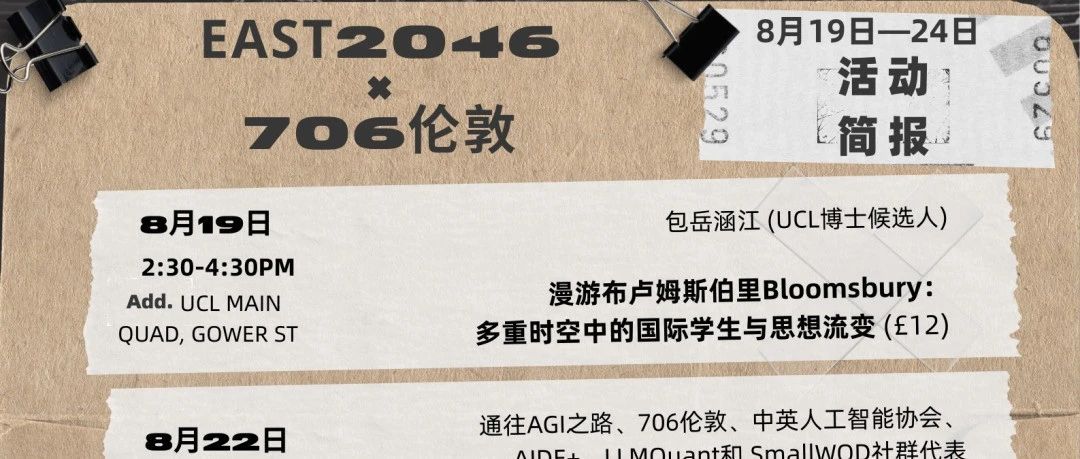 EAST2046 是一个面向未来的文化艺术节,融合了数字艺术、社群仪式和技术。艺术节以海外华人群体的生活经验为根基,通过实验性的形式与协作性的实践,重新思考东方文化与未来的关系。我们不复制过去,而是在科技创新与艺术感知之间架起桥梁,构建新的文化表达方式。受德勒兹与瓜塔里的「根茎」(rhizome) 概念启发,EAST2046 展开为一个去多节点的文化网络——开放、非等级、持续生长。我们的网络由协作的能量驱动,以公共空间为场域,每一个事件都是文化生成网络中的创意节点。移民社群的社会网络构成了这张文化建筑的骨架。我们不仅激活这些网络作为观众,更邀请他们作为共创者,参与主办分会场,承担策展角色,从零开始塑造现场体验。首届 EAST2046 于伦敦市中心启动,设有主会场与多个由本地移民社群承办的分会场,涵盖展览、表演、音乐、装置、市集、对谈与互动体验等 10–15 场活动。我们也将公共空间视为重要的“现场”之一,借鉴法国哲学家列菲伏尔提出的“城市权利”概念——即城市空间应由其居民共同塑造与重新主张。我们强调共创式参与。通过数字和空间介入——包括沉浸式装置、交互式 AI、实验声音和文化驱动的实验室——我们激活公共空间,重新激活散居社群的文化叙事。我们的目标不是举办一个静态的活动,而是提出一种文化生成的“协议”,同时构建一个由社群驱动的文化基础设施原型。706 青年空间作为给青年人提供思想和身体栖息之地的重要华语空间,是 EAST2046 科技艺术节的重要伙伴。706 的精神也给 EAST2046 提供了丰富的土壤:我们建立网络、多点链接、开放协作。从某种程度来说,EAST2046 和 706 有着契合的气质。这一次,EAST2046 和 706 伦敦合作,在 8 月 19 日到 8 月 24 日之间展开一系列的公共活动。其中也包括和其他例如通往 AGI 之路等社群的合作。这一周,我们想和你在城市的缝隙里相遇,慢慢把“在他乡”的心事化成可以被看见、被拥抱的空间。8/19,我们在布卢姆斯伯里边走边听,循着楼房与街名,追索一代代国际学生的脚步与城市变迁;8/22,和 706 等社群的代表和主理人们坐下来谈谈 AI/Web3 时代怎样把人真正连在一起——不靠口号,靠方法、工具和彼此托举;8/23,我们带着各自的故事在草地上围坐,试着重新想象“家庭”和“关系”的模样,也给还没被命名的生活一处落脚点;8/24,走进北伦敦的一家中餐外卖店,三杯茶把记忆与地理串起来,我们一起把“移民美食地图”贴在墙上,让味道成为方向。傍晚的气功把身体安放回当下,随后在东伦敦的城市漫步里,从米粉馆到港风小吧、从玩具店到画廊与隐秘茶馆,东伦敦现在也是新的中国城,重新开始书写新一代东亚和东南亚移民的故事。感谢 706 伦敦与所有伙伴的同行——如果你也正在寻找自己的位置,就来吧。在他乡,不管在边缘还是在中心,我们都会有自己的空间和声音。01: 漫游布卢姆斯伯里 Bloomsbury: