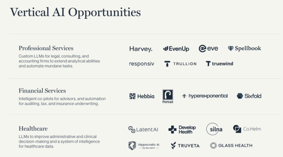 我们相信 AI 将重塑几乎所有行业垂直领域,以下是三个尤其令人兴奋的方向: