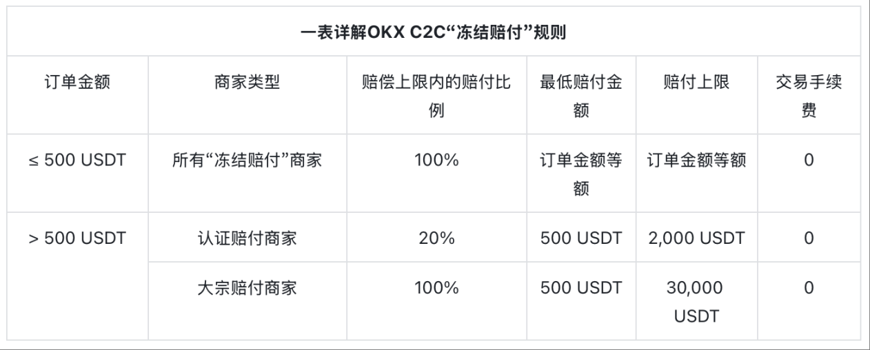 OKX C2C 现已正式上线了全新的「冻结赔付」体系。简单来说,今后用户在 OKX C2C 交易区与带有「冻结赔付」标识的商家进行交易,不但免手续费,且一旦因对方付款导致自己的收款账户被冻结,符合条件的用户就可以按照平台规则获得相应的资金赔付:最高 100% 赔付比例,单笔赔付上限高达 30,000 USDT。这一赔付额度远高于此前其他平台提供的保障,充分体现了 OKX 保障用户资金安全的决心和实力。