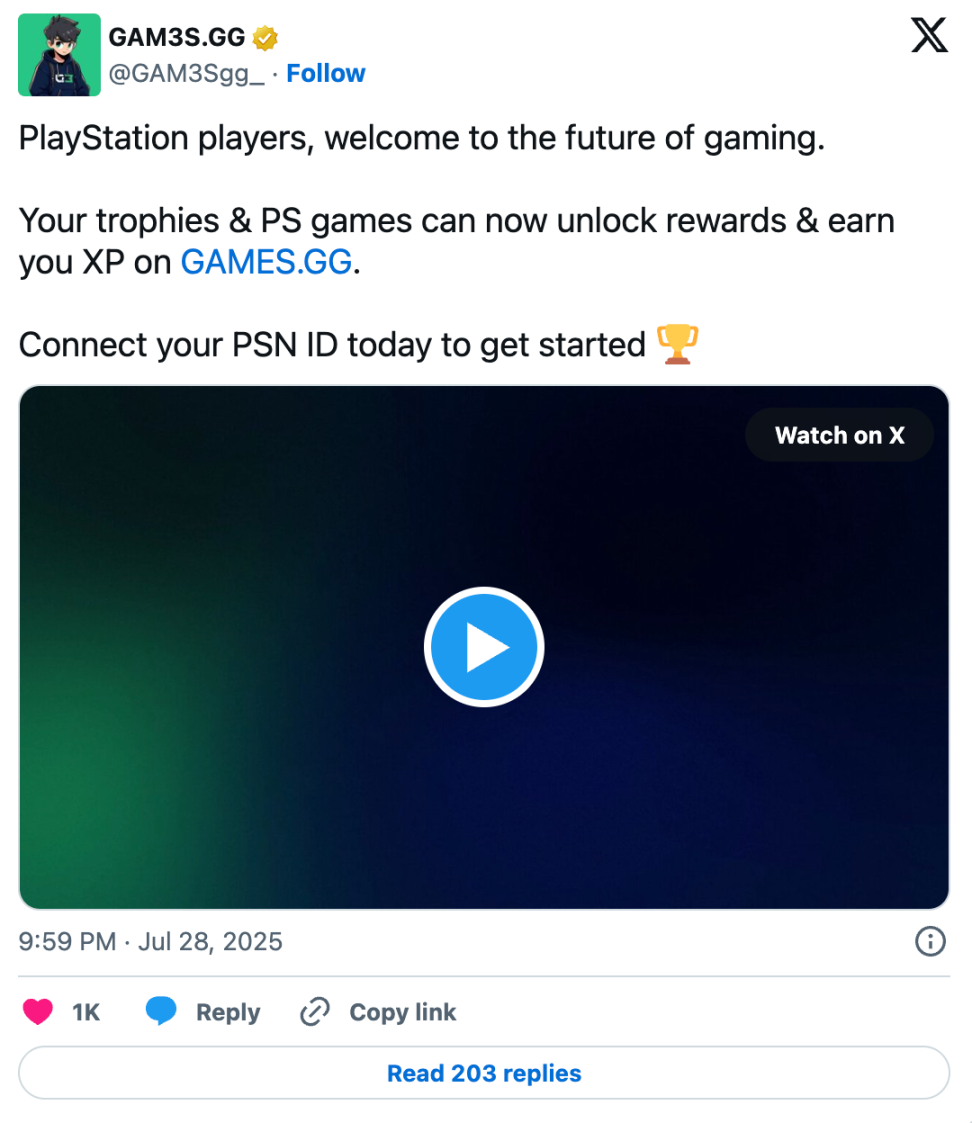 PlayStation 集成是我四年来最喜欢的公告,因为我终于可以在自己的平台上用赢得的奖杯获得经验值了,这就是我们正在打造的体验。