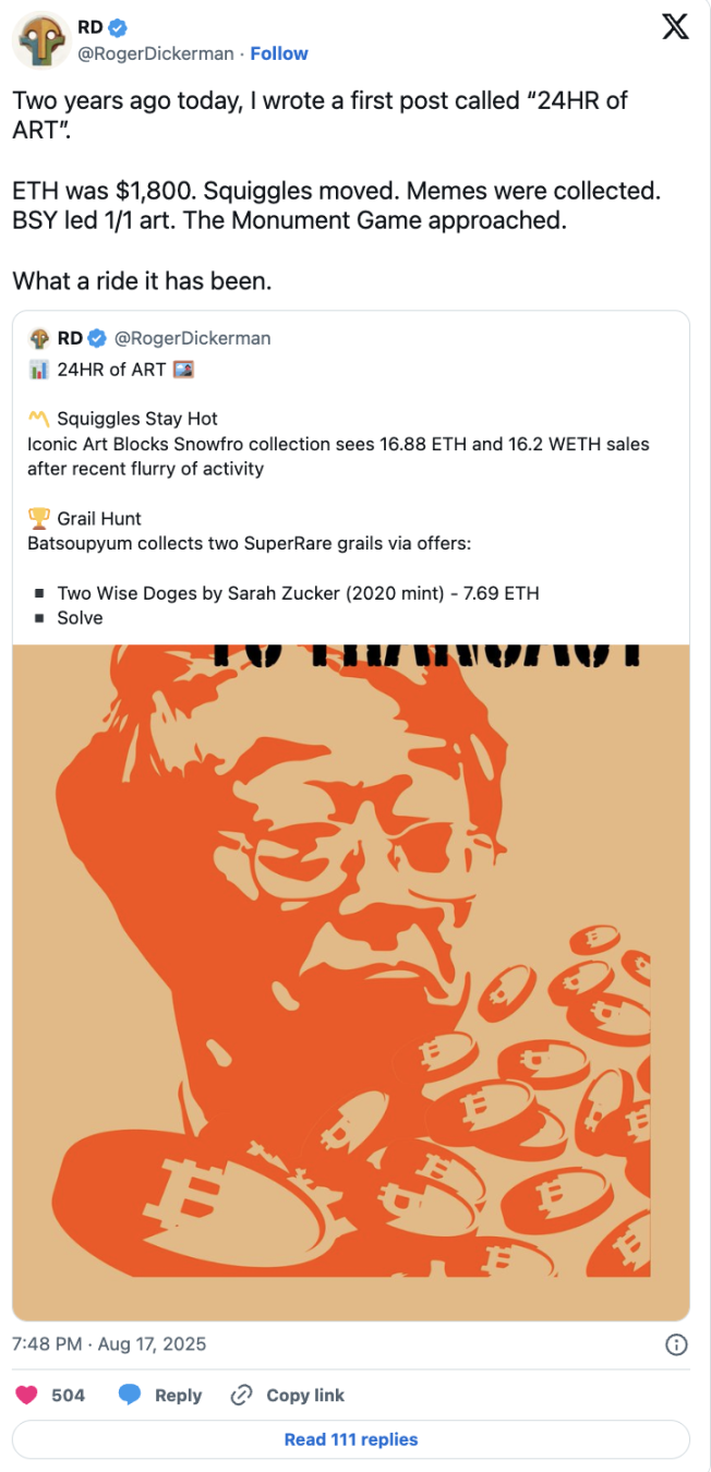 我们采访了 Roger,畅谈他进军 Web3 的历程、他始终秉持的“艺术家至上”的创作理念,以及《24 小时艺术》如何从一份日常快照发展成为社群、策展和文化记录的基石。