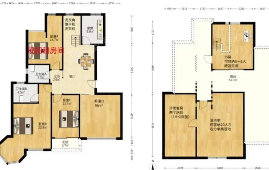1.200㎡的大 house!4 室 2 厅,公区有上下铺沙发客床位(可住 4-6 人),有电梯,大客厅、大厨房、大露天阳台等等。