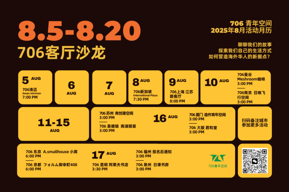 这个月,我们把客厅开到了东南亚的 6 个城市。从曼谷到新加坡,从清迈到吉隆坡,海外的华人青年们聚在一起,探讨如何在这个全球化的浪潮中,营造属于自己的新据点。他们聊到了如何在异国他乡寻找归属感,如何建立跨文化的连接,如何把 706 的精神带到世界的每一个角落。这场跨越山海的讨论,让我们看到了更大的世界,也看到了更紧密的连接。