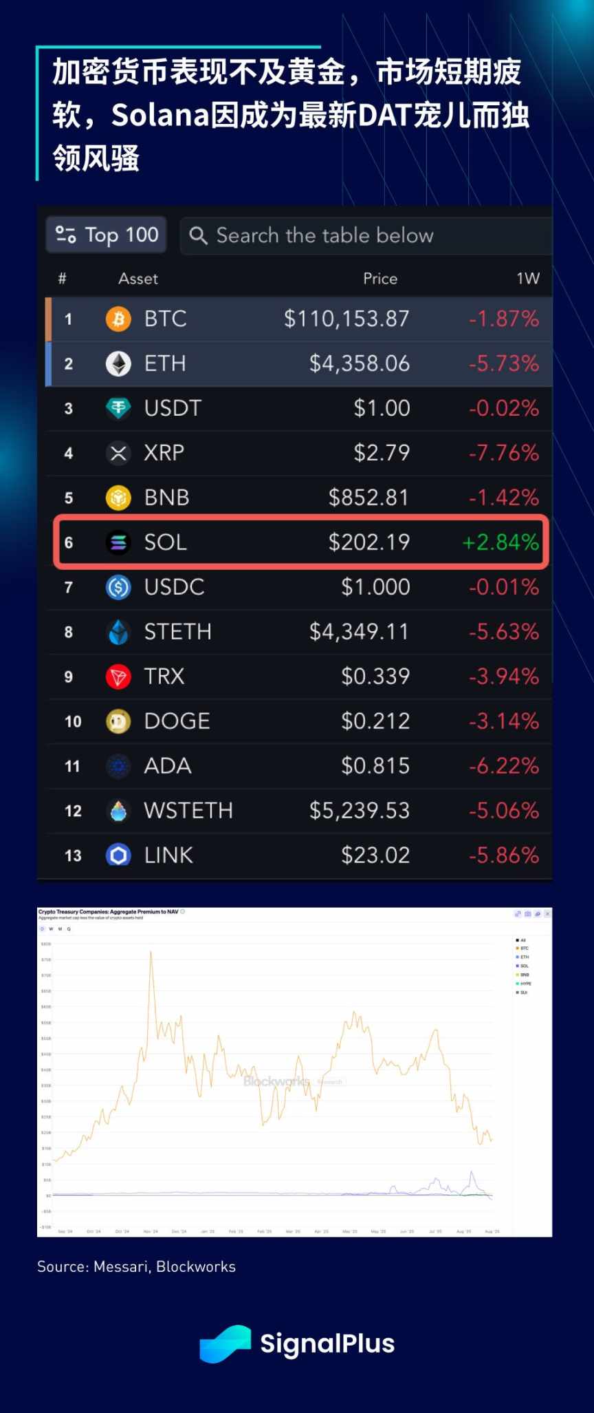 在加密货币领域,尽管黄金表现强劲,但加密货币价格上周下跌,市场泡沫似乎略有消退,DAT 溢价整体回落至长期低点附近。新资金流入似乎见顶,资金轮动现象出现,Solana 成为本周唯一上涨的加密货币,SOL 成为 DAT 热潮的最新目的地,链上总锁定价值(TVL)也出现显著反弹。
