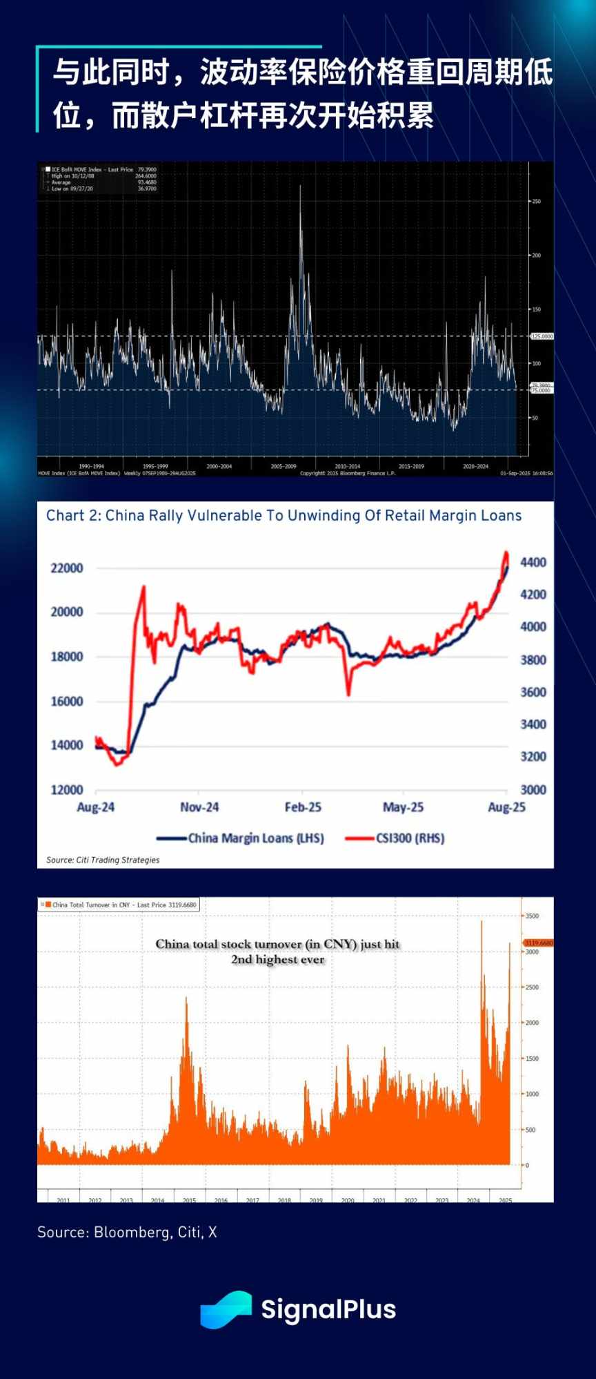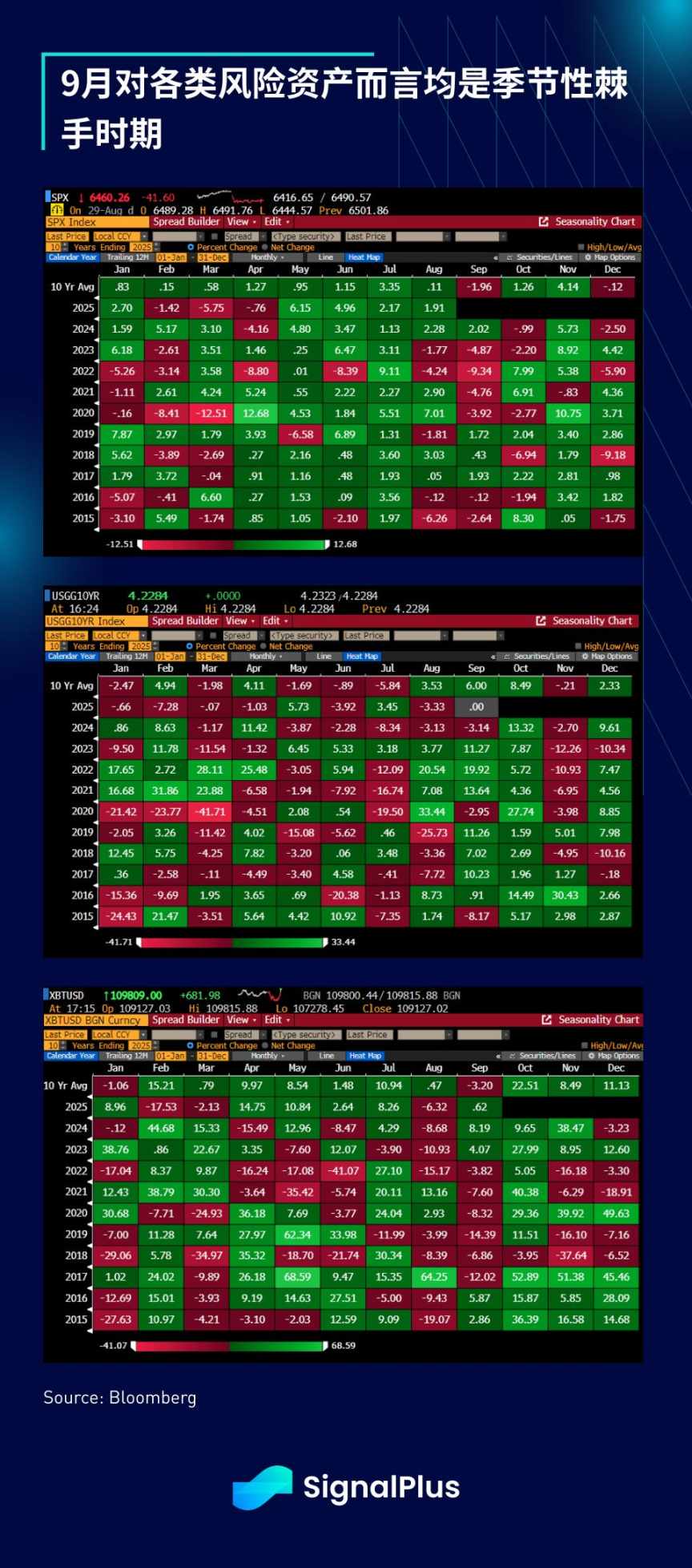 展望未来,我们预计 9 月将是风险资产整体波动加剧的一个月。过去十年中,9 月季节性表现对股票(下跌)、10 年期国债收益率(上升)和比特币(下跌)均不友好。与此同时,波动率溢价处于周期低位,而风险杠杆正在积累。鉴于美联储已提前“预支”宽松意图,如果风险资产在 9 月出现下跌,还有什么牌可打?