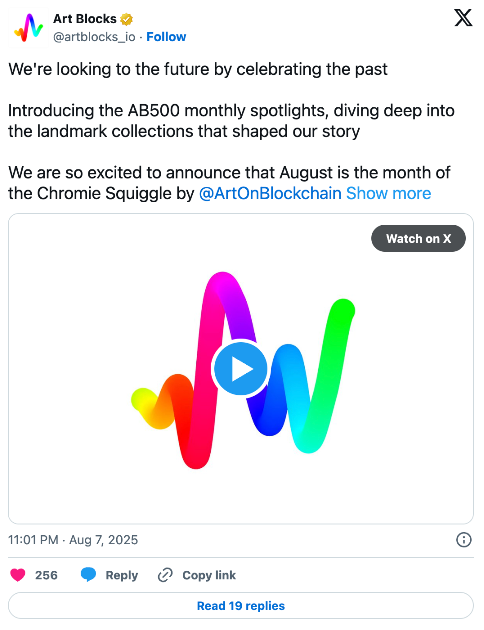 Chromie Squiggle 最初只是他创意的简单视觉演示,如今已成为标志性作品,却迅速成为一场运动背后的创意火花 - 为基于代码的艺术带来了永久性、互动性和更广泛的可见性。