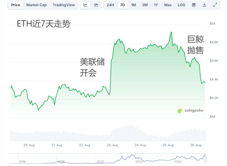 在刚刚过去的杰克逊霍尔年会上,美联储主席鲍威尔的发言显著偏“鸽”。核心要点是:市场第一反应极为兴奋:比特币一度突破 $117,000,以太坊也摸到历史高位 $4,950。然而,金融市场的残酷之处就在于,当所有人都在看多的时候,巨鲸常常选择反手出击。就在市场情绪最高点时,一只长期沉睡的钱包(19D5J…WoZ1C)被激活。这只巨鲸地址持有的筹码大多可以追溯到 2016-2017 年挖矿时期,意味着其持仓成本低到不可思议(部分筹码成本可能低于 $1,000/BTC)。- 周末短短几个小时内,该巨鲸向市场抛售了 24,000 BTC,市值超过 26 亿美元。