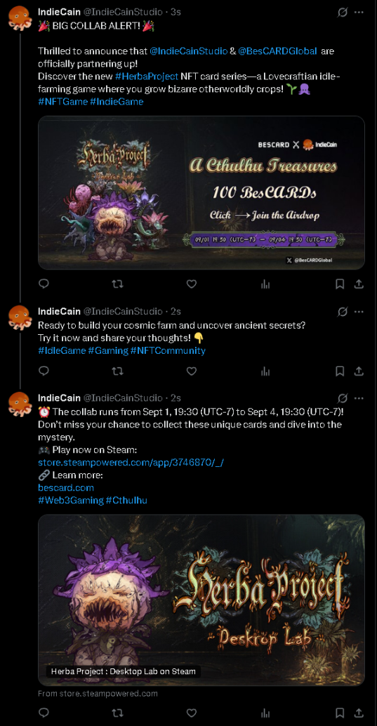 很开心《本草计划·桌面实验室》的第一批 NFT 卡牌在今天正式上架了,这是一次有趣的跨界尝试,也让我重新思考了一下独立游戏在发行板块能做的事情。故事开始于今年 8 月初的 ChinaJoy,我带着《深渊谜影》去了上海,意外认识了一家做 NFT 的团队 BesCard。他们的官网在这里https://bescard.com/由于我自己工作上的需要,之前有过对 Web3 和 NFT 的了解,但是亲自接触还是头一次。他们打算推广自己的平台,所以正在找一些游戏项目合作,我一听刚好《本草计划》这款就很适合他们:作物卡图非常精美、有不同种类(稀有度)、故事比较好理解、题材海外玩家接受度较高。因此我们就约着 CJ 结束后找个时间谈谈具体的合作事宜。众所周知,NFT 在国内的风评跟 EA 抢先体验相似——不能说用了的都有问题,但的确很多用了的都是榨片,这就让我一开始保持着很大的戒备心。我担心的事情其实很简单:如果这个平台有法律风险,我是不是会被连累到。因此,我跟他们的对接者进行了几次深入的语音交流并且反复查看了合同内容。就结论来说,至少这家平台目前看来没有什么明显的风险项,并且合同内容确保我可以从潜在风险中抽离出来,这让我对后续的合作产生了一定的信心。而具体的合作模式是,我提供项目的一部分资产,比如卡图、作物信息等,他们将这些资产上链然后在海外进行推广。我作为项目研发方,相当于多了一个宣传的渠道,他们作为新兴的平台获得了更多的可交易商品,属于各取所需,合作共赢。合作流程上,先达成合作意向,我刚接触他们的时候他们平台上的产品还挺“寒酸”的,但是随着后续这波联动的产品上架后,品质有了长足进步,比如下边这套就相当精美了:之后签订合同,由于这次是初次合作并且他们需要自己支付相关的技术成本和宣传成本,所以并没有给项目方任何后续收益的分成。合同签订后,我提供他们需要的各种资料,比如上文提到的卡图、作物描述、故事介绍以及团队介绍和 Logo 等,用于他们后续的宣传。最后就是正式上架时的推流,他们主要是在 X 平台上做宣传推广,并且建议我也进行同步的宣发。整体的沟通还是非常顺畅的,能感觉到他们团队对商业推广是比较擅长的,并且也具备相应的能力(比如针对项目风格进行卡牌的包装)。