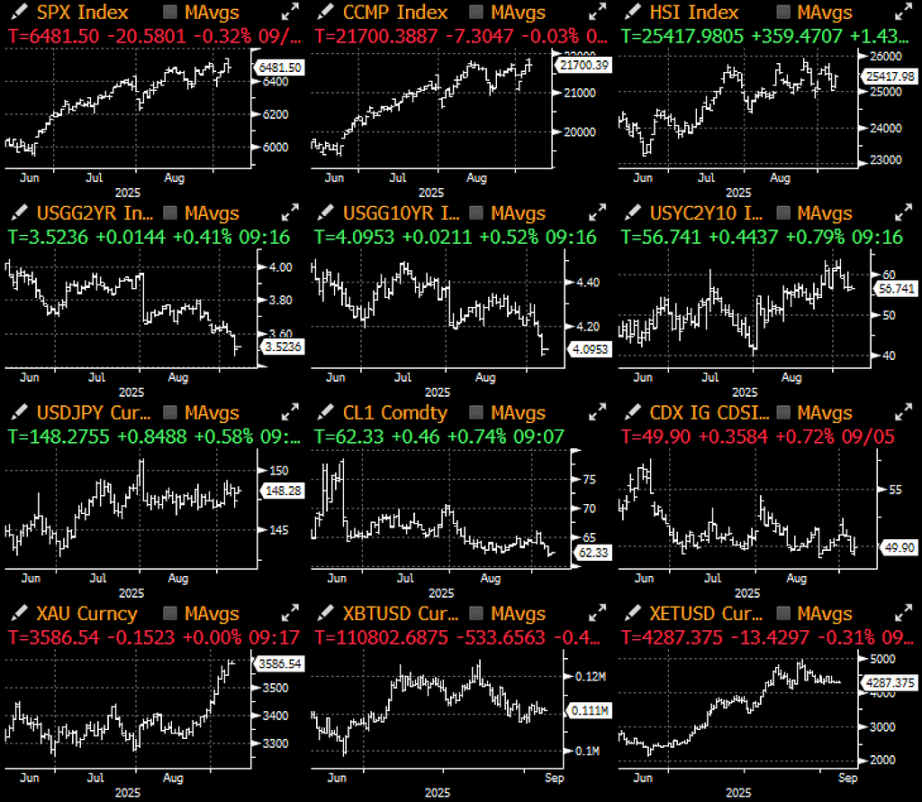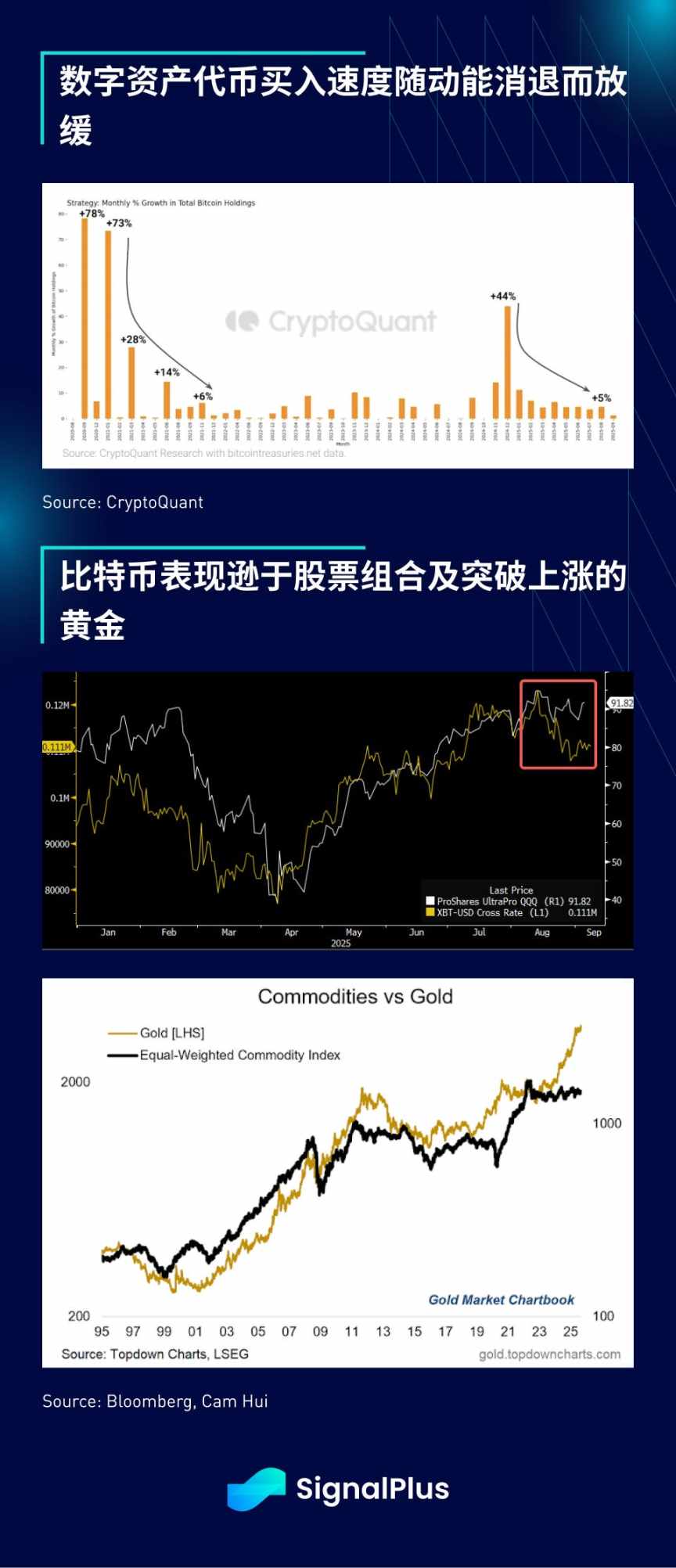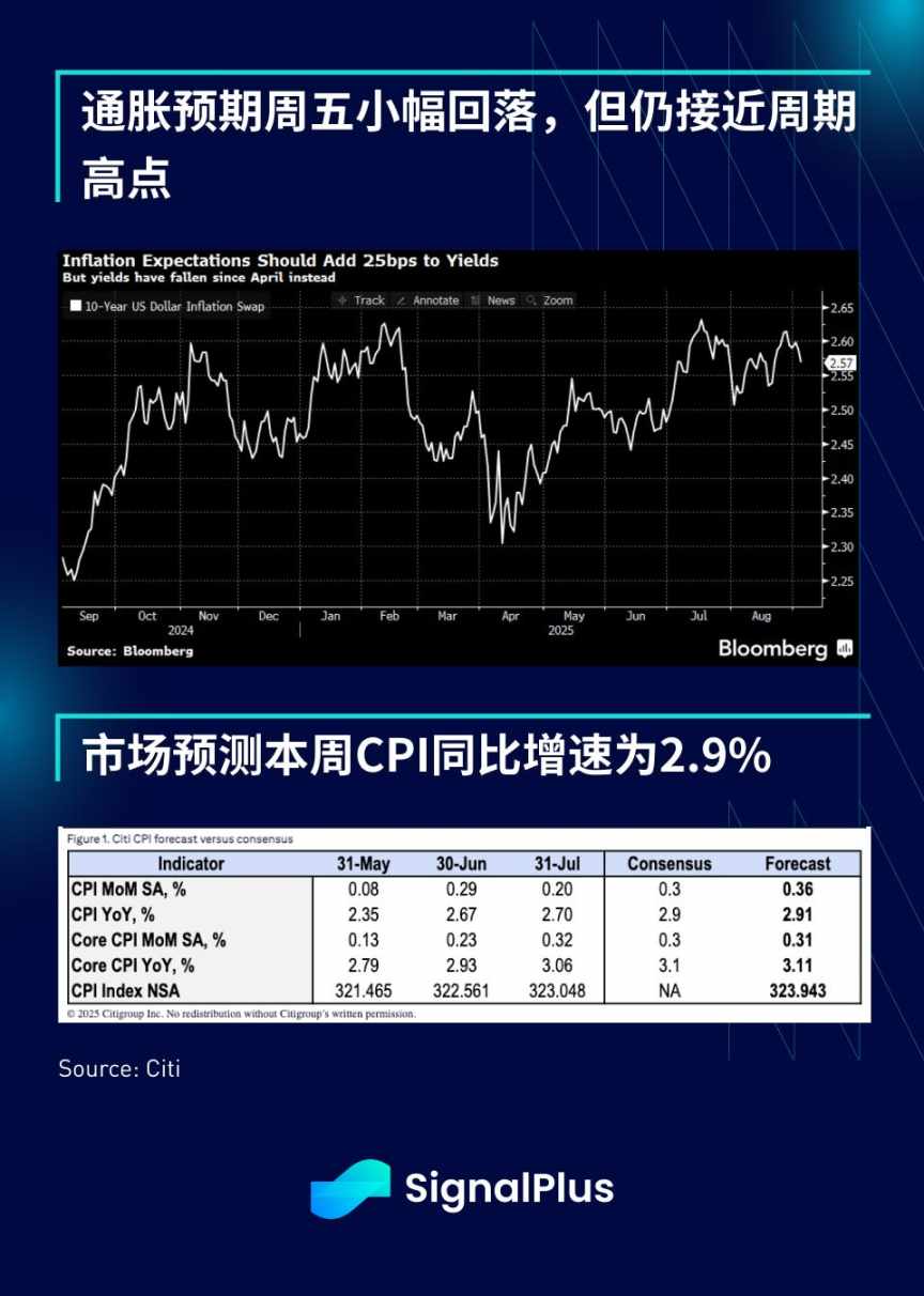 通胀预期受控:随著投资者重新评估经济放缓预期,通胀互换和长期债券盈亏平衡通胀率均走低,市场预测本周 CPI 数据为 2.92%。交易员将重点关注潜在通胀放缓的确认信号,以佐证杰克逊霍尔会议后美联储激进的鸽派转向。未来数月资料将揭示是否会出现关税相关价格压力的初步迹象 — — 在当前时点,任何偏鹰派的高位通胀资料都对风险资产不利。
