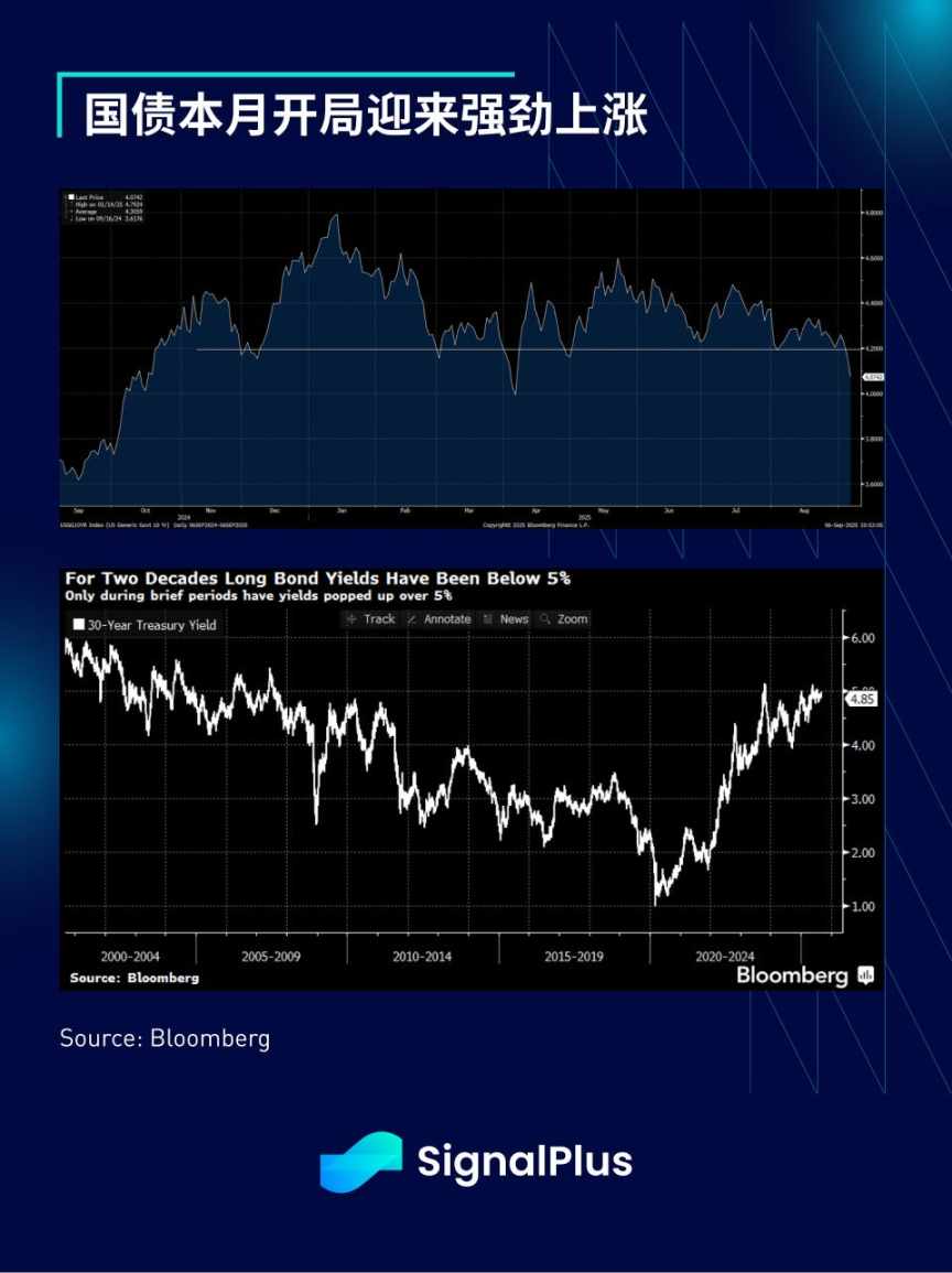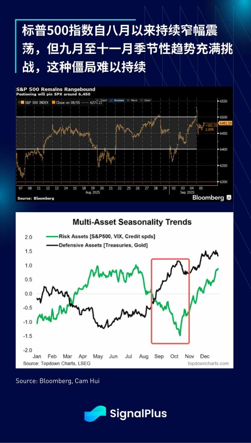 股市上周整体持平:英伟达的疲软被其他龙头股和防御性板块抵消,标普 500 指数重回夏末交易区间中轨。如上周所述,鉴于季节性趋势挑战叠加摩根大通报告显示对冲基金净杠杆率处于高位,预计未来两个月波动性将加剧。