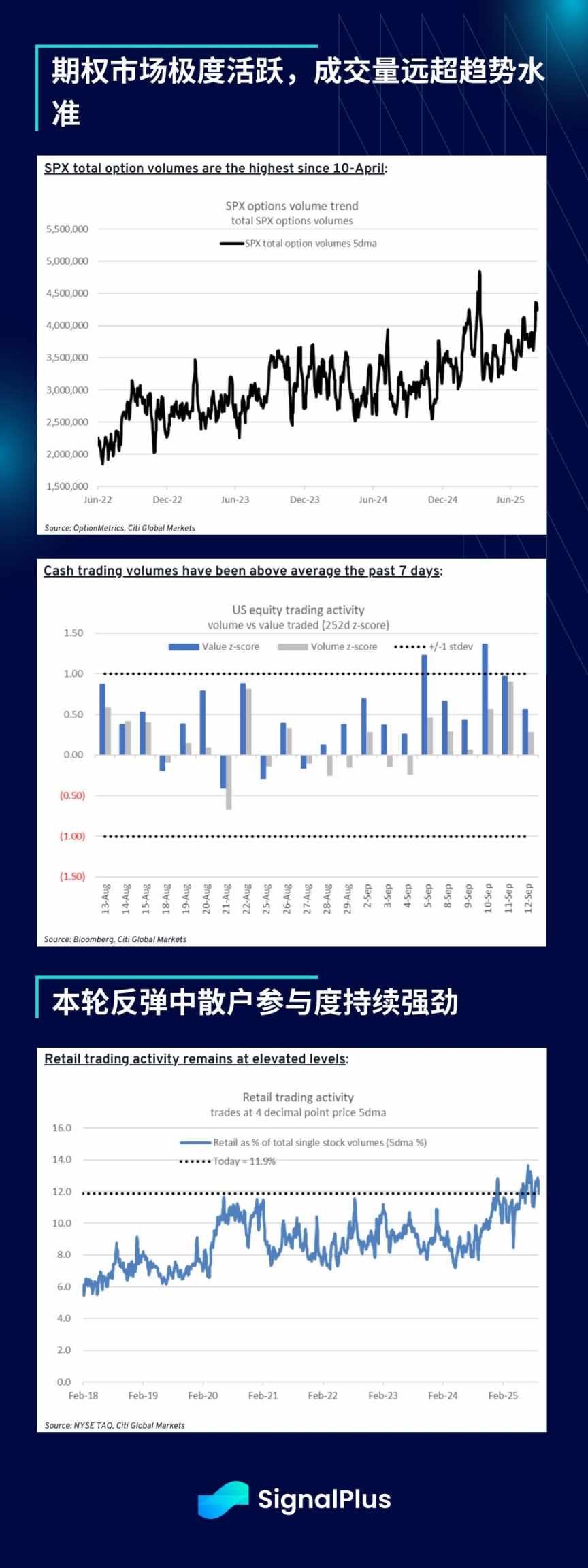 标普 500 期权成交量较 12 个月均值高出 20% 以上,卖方经销商资料显示散户交易量占比约 12%。