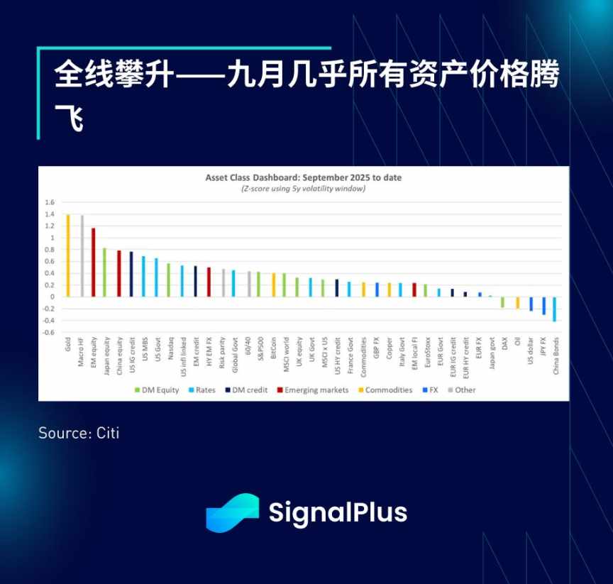 全球市场情绪同样升温,恒生指数攀升至四年高位,台湾加权指数连续数周创历史新高。黄金成为本月迄今表现最佳资产,宏观对冲基金紧随其后,无论从何种维度审视,所有风险资产确实呈现普涨格局。