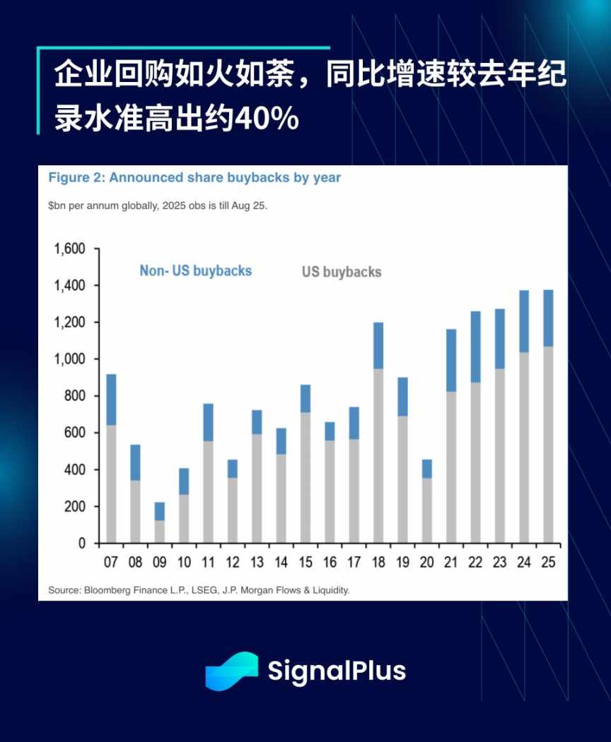 狂热氛围中,企业回购正以惊人速度推进:前八个月回购规模达 1.4 万亿美元,已刷新历史纪录。较 2024 年同期增长 38%(当年本身已创纪录),涨势堪称烈火烹油。