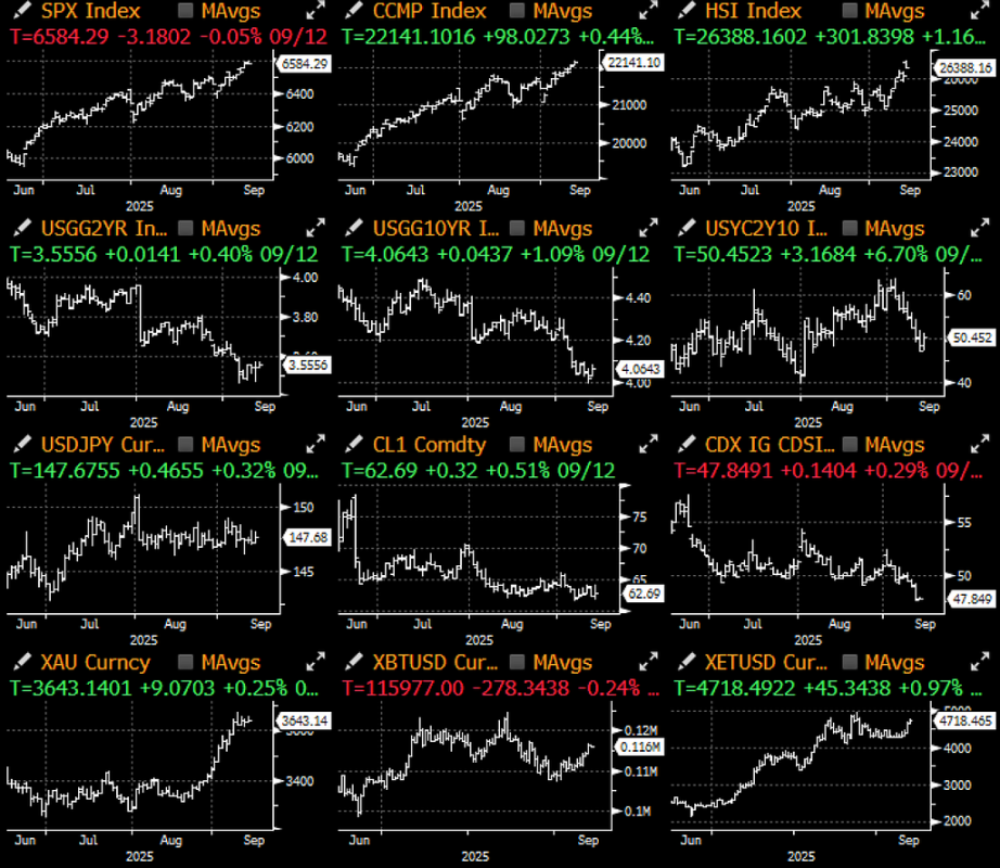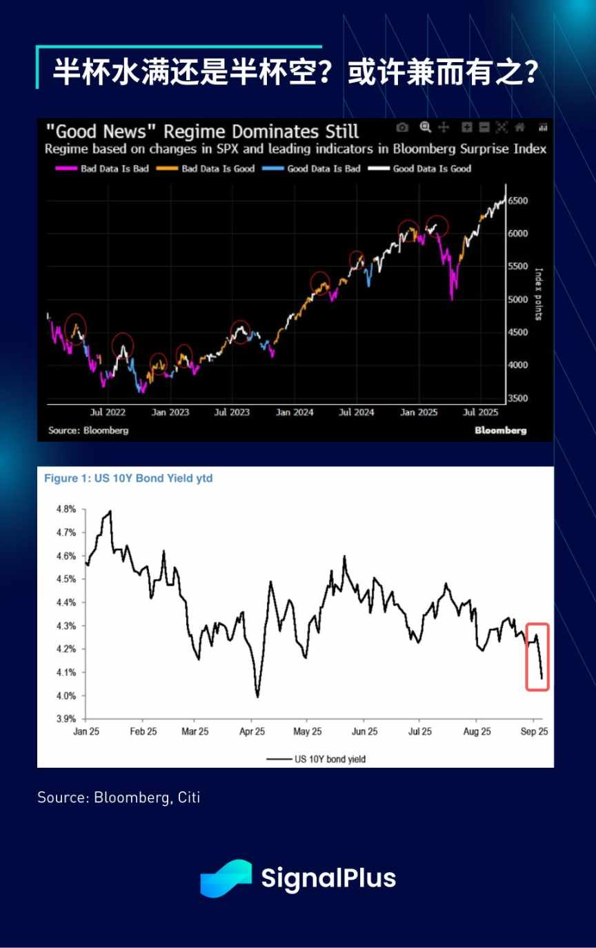 与之形成鲜明对比的是,股市(照常)描绘出完全不同图景:标普 500 指数本周三次刷新收盘纪录,过半成分股交易于 100 日均线上方。甲骨文惊艳财报重振受挫的 AI 情绪,各板块全线飘红 — — 半导体(+6%)、银行(+3%)、公用事业(+3%)和软体(+3%)均表现亮眼。