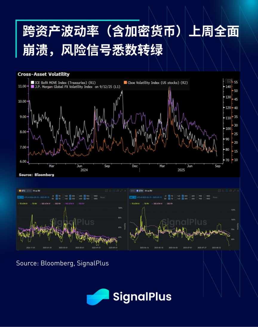 市场内在结构同样强劲,所有主要宏观资产类别隐含波动率均跌至阶段性新低,国债领跌。