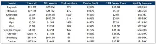 在 Pump.Fun 的交易分成下,主播达成同一收入的门槛迅速降低。仅 9 月 15 日,Pump.Fun 救支付了超过 400 万美元的创作者奖励。其中,有 9,000 个钱包领取了 280 万美元的创作者费用。这意味着平均每位创作者每日可获得约 300 美元的报酬,若模式持续,每月可获得约 9000 美元的报酬。而在 Twitch 上,达成 6 位数的收益至少需要每场 1 万以上的在线人数,在 Pump,数千甚至几百人就可实现,例如市值仅 62 万美元的代币 Cameo,聊天室仅仅 28 人,24 小时创作者收入就可达到 3 万美元。