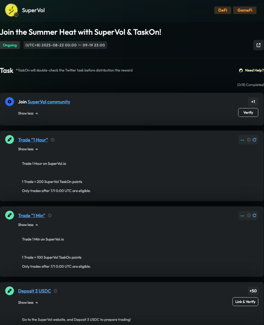 作为一个游戏化加密期权交易平台,SuperVol 通过在 TaskOn 上设置基于交易笔数的积分奖励机制,量化用户贡献值,并通过积分兑换激励高频交易行为,显著提升用户活跃度。